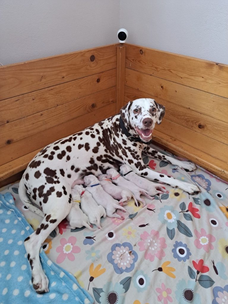 Spotty memories – vrh O Šteniatka 25.09.2023 Dňa 20.08.2023 sa v chovateľskej stanici Spotty Memories narodilo 6 šteniatok – 2 psíci a 4 sučky. Farebne ide o 2 čiernobodkované šteniatka (1 psík, 1 sučka) a 4 hnedobodkované (3 sučky a 1 psík).